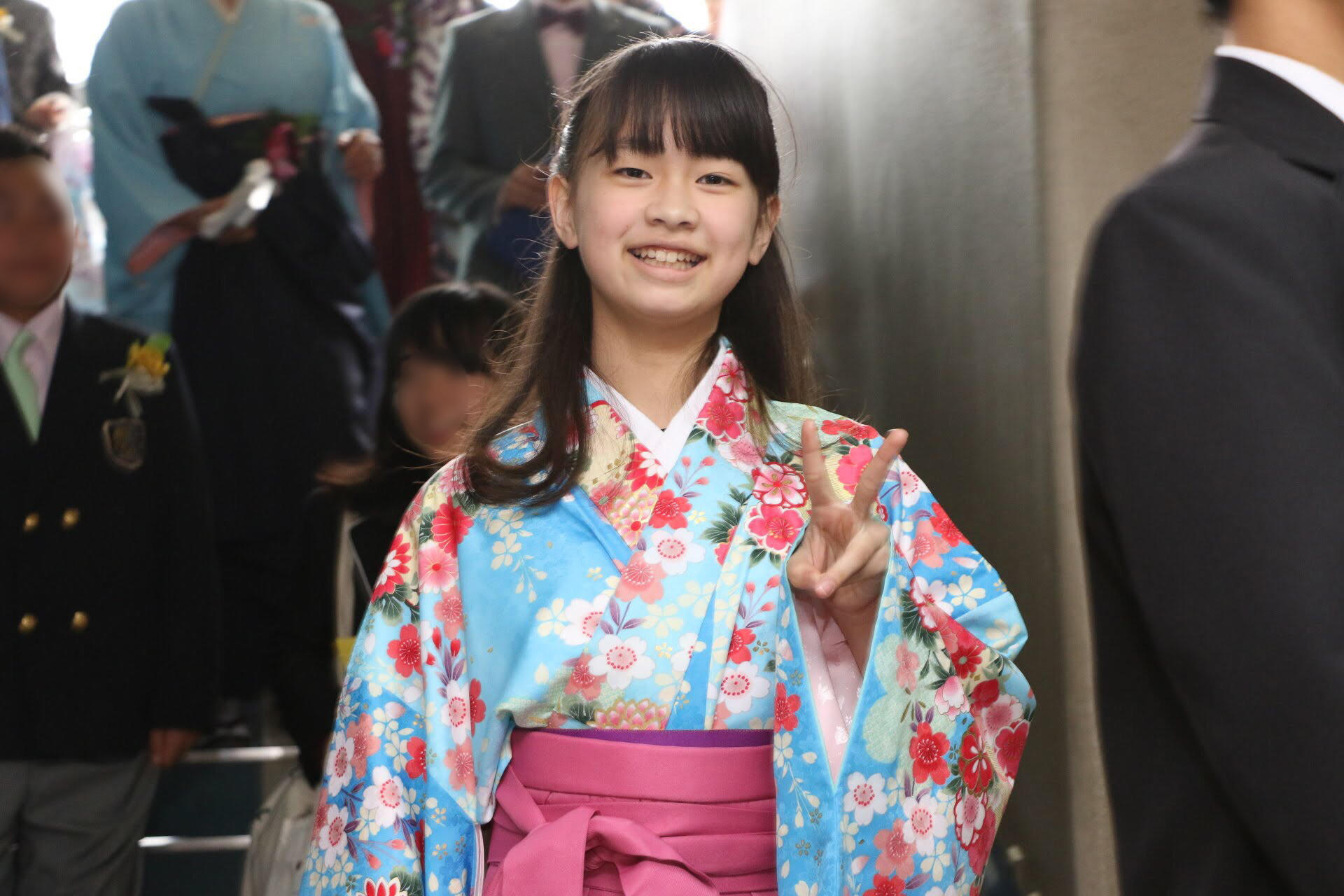 小学生の袴姿らしい髪型と髪飾りで、とても好感の持てる袴姿ですね。 袴の小学生が増えたのは良いのですが、他社様では大学生の袴と兼用されているケースがほとんどなので、その場合『小学生らしい可愛さ』に少し欠けるように思います。 小学生には小学生専用の袴がやっぱりいいですよね。 みんなが憧れる袴姿実現のため、まだまだ努力します。