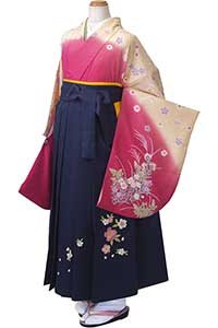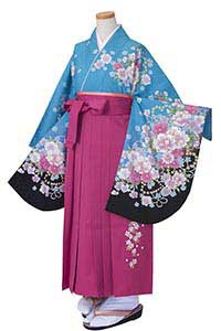 黒ベースの着物ですが、華やかな柄と相性の良いショッキングピンクの袴でとってもかわいいセットになっています。