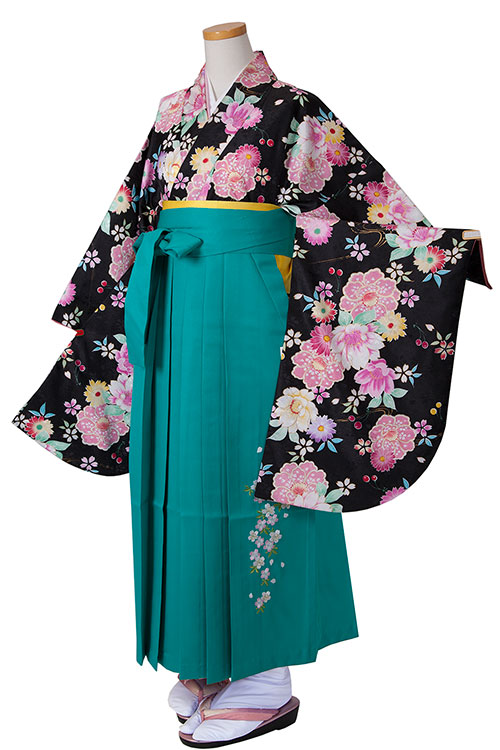 黒の着物ですが、華やかな柄とエメラルドグリーンの袴で華やかに。