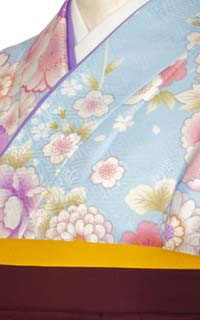 春らしくさわやかなスカイブルーの着物です。柄の淡いお花の色も清楚で小学生にピッタリ。