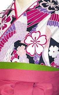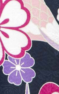 紺地の着物ですが、華やかに埋め尽くす柄やピンクの袴でとても明るい元気な女の子を演出。