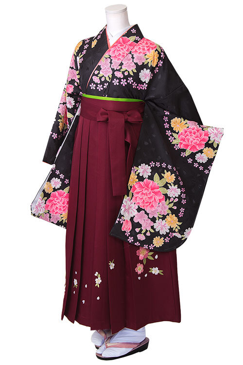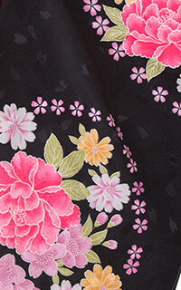 黒の落ち着いた雰囲気の中にもピンクの小学生らしい柄になっています。えんじの袴が黒を引き締めてくれますよ。